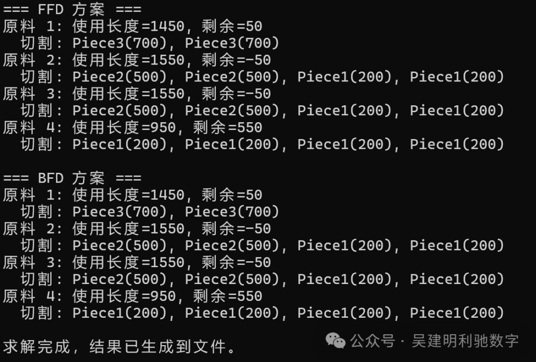 文件驱动主程序 using System.Text.Json; class Program { static void Main () { string inputPath = "job.json" ; string outputFFD = "output_ffd.json" ; string outputBFD = "output_bfd.json" ; Job job = JsonSerializer.Deserialize<Job>(File.ReadAllText(inputPath)); var ffdStocks = SolveFFD(job); var bfdStocks = SolveBFD(job); File.WriteAllText(outputFFD, JsonSerializer.Serialize(ffdStocks, new JsonSerializerOptions { WriteIndented = true })); File.WriteAllText(outputBFD, JsonSerializer.Serialize(bfdStocks, new JsonSerializerOptions { WriteIndented = true })); Console.WriteLine( "FFD 和 BFD 求解完成,输出已生成。" ); } }