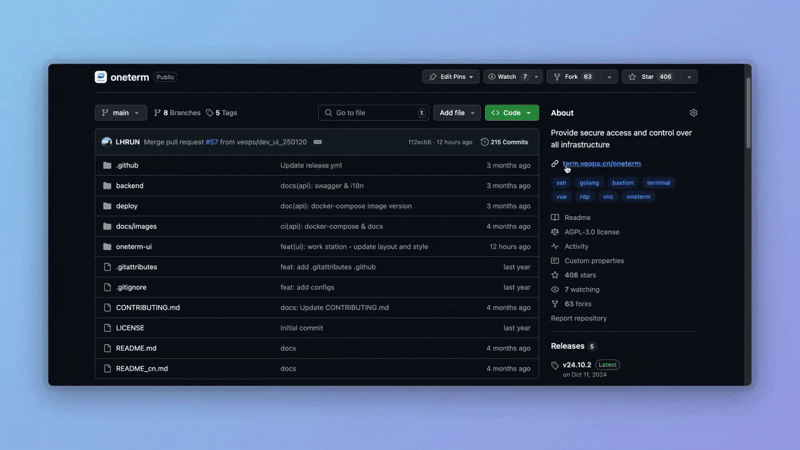 OneTerm 是一款简单、轻量、灵活的企业级堡垒机,基于4A(Authen认证、Authorize授权、Account账号、Audit审计)合规标准设计和开发。它通过严格的访问控制和监控功能,确保系统的安全性和合规性。