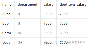 AVG(salary) OVER (PARTITION BY department) AS dept_avg_salary