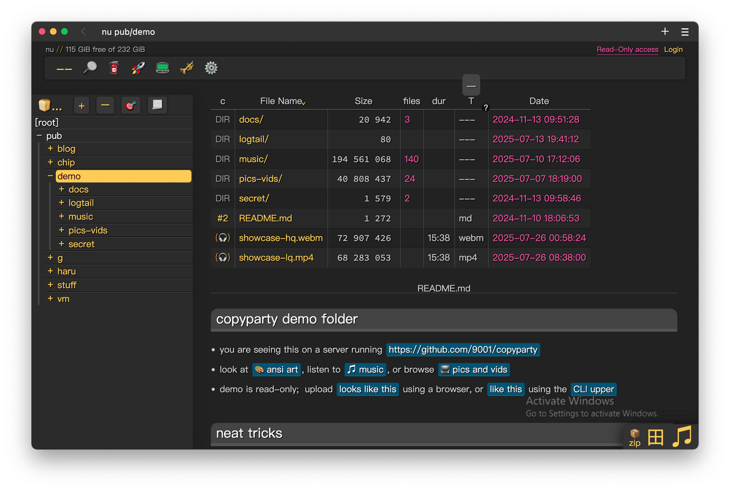 这是一款基于 Python 开发的多功能文件服务,所有功能集成在单个 Python 文件,零依赖、仅需一条命令即可启动。通过浏览器即可完成文件浏览、上传、下载、在线播放等操作,并支持多线程加速上传、断点续传和文件去重等功能。除了网页访问,还兼容 WebDAV、FTP、TFTP 等多种文件传输协议。