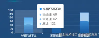 // 数据配置 - 包含已处理和未处理的数据 const chartData = [  { name: "车辆只进不出", processed: 60, unprocessed: 62, total: 122 },  { name: "预警模型2", processed: 72, unprocessed: 82, total: 154 },  { name: "预警模型3", processed: 71, unprocessed: 91, total: 162 } ]; // 创建水波柱状图配置 const createOption = () => {  return {    backgroundColor: 'transparent', //echart背景为透明    animation: false,    tooltip: { //提示窗配置      trigger: 'axis',      axisPointer: {        type: 'shadow'      },      formatter: function(params) {        const data = chartData[params[0].dataIndex];        return `${params[0].name}<br/>已处理: ${data.processed}<br/>未处理: ${data.unprocessed}<br/>总计:${data.total}`;      }    },    grid: { //图表位置占比配置,尽量居中      left: '3%',      right: '4%',      bottom: '12%',      top:'5%',      containLabel: true    },    xAxis: {  //配置x轴      type: 'category',      data: chartData.map(item => item.name),      axisLabel: {        color: '#fff',        fontSize: 12      },      axisLine: {        lineStyle: {          color: '#fff'        }      }    },    yAxis: { //配置y轴      type: 'value',      axisLabel: {        color: '#fff',        fontSize: 12,      },      axisLine: {        lineStyle: {          color: '#fff'        }      },      splitLine: {        lineStyle: {          color: 'rgba(255, 255, 255, 0.1)'        }      }    },    series:series //配置数据项  }; };