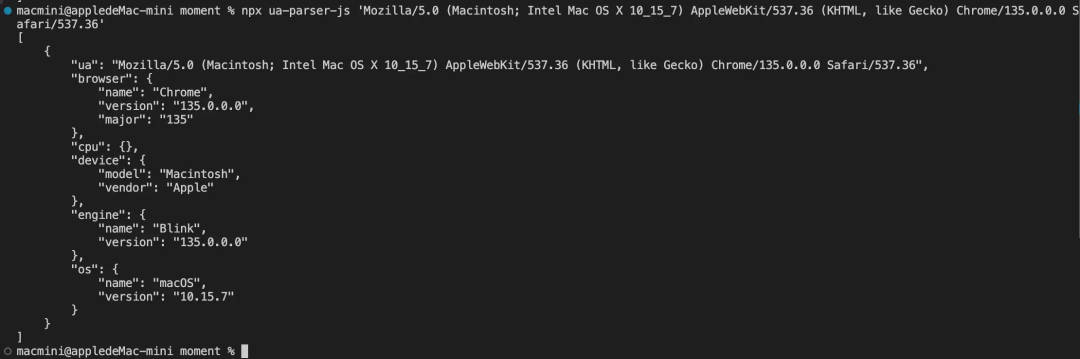 npx ua-parser-js 'Mozilla/5.0 (Macintosh; Intel Mac OS X 10_15_7) AppleWebKit/537.36 (KHTML, like Gecko) Chrome/135.0.0.0 Safari/537.36'