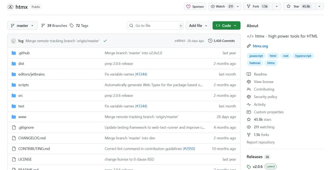 是一个非常酷的前端工具,它让你在纯 HTML 中就能搞定 AJAX、CSS 过渡动画、WebSocket、服务端发送事件(SSE)等交互功能——而且不需要写一行 JavaScript。它体积超小(gzip 后约 14 KB),无任何外部依赖,还非常容易扩展,说它是超能力的 HTML 工具箱一点也不夸张