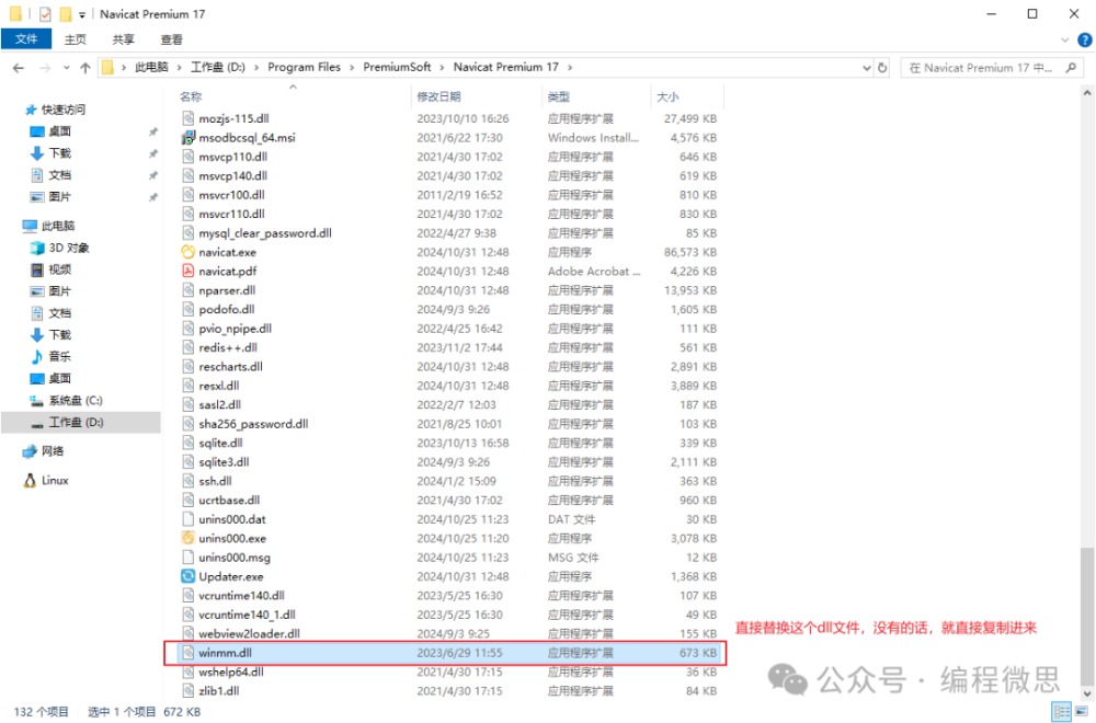 替换dll文件,这个可以一劳永逸,不用经历每14天来一次的那种困扰。 也很香,只是这个看起来就不是绝对安全了,因为这个dll是大佬提供的,不知道改了啥,姑且不论大佬没必要耍手段,相对来说没有第一种安全。 ![]() 我在两台机器上做过测试,这两种方式都可以搞定Navicat17,只是没找到像之前的版本一样的那种带UI的注册机,找到的一些标题党的文章,进去试了也只是16.x版本才能用。 个人的一点看法 相信很多人看到这两种方式之后,都倾向于使用第二种方法,毕竟这种方法一劳永逸,但又会担心数据安全问题。 诚然,数据安全无小事,但是想使用盗版,那就必须要承担一定的风险,不能既要又要,而且人家也犯不着没事儿干你。 如果公司项目是2G或者2B这类,可以直接使用第一种。 阅读原文:原文链接 该文章在 2025/9/5 16:18:26 编辑过 |