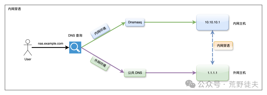 此时我们通过引入域名解析机制来解决问题:在外部网络中,使用公共 DNS 将域名解析至中继服务器地址;而在内部网络中,则通过本地部署的 Dnsmasq 服务,将相同域名解析为内网主机地址。通过这一方式,实现了基于访问来源的精确分流,内外网访问各走其道,互不干扰。