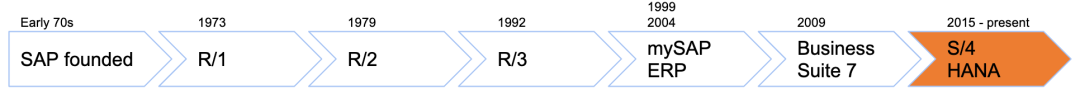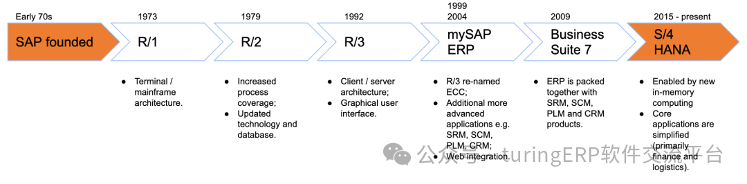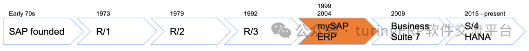 SAP产品的发展历史,大致分成以下六个发展阶段,并大概每十年一次大的迭代升级产品的过程。