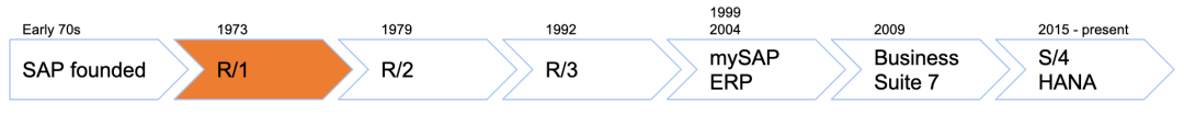 SAP由上个世纪七十年代初的几个前IBM员工创立。他们开发出的第一个系统称之为RF(实时财务),后来改名为R/1,这个字母R,Realtime实时的意思,它是一款基于大型主机上运行的系统, 这个在当时可谓是相当具有技术创新意义的,要知道IBM大型机System/360在1964年才发布;Unix在1974年才第一次对外公布消息;Oracle 也是在1978年才开始创业。