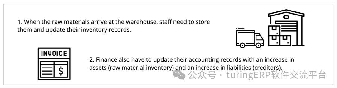 一个来自制造业的例子。原材料被转换为成品,然后出售并运送给客户。这个过程涉及许多部门。采购,仓储,制造,财务,销售等。如果我们仅考虑其中一部分,从供应商处接收原材料,需要进行两项活动。