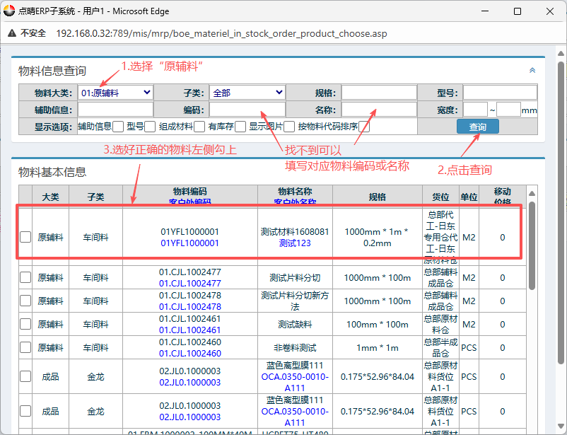 ![]() ![]() 1.进入ERP系统之后,在左侧的功能菜单里下方可以找到“BOE定制”,点击后找到“正常加工”。 然后点击打开“新增BOE组件来料单”。 2.进入“新增BOE组件来料单”界面后,先填写好基本的信息:入库仓库、收货日期。 以及有需要的话可以根据情况填写来料的备注信息。 3.填写BOE组件来料单的信息,首先点击“物料编码”,接着就会弹出查询物料的窗口。 按照图里的顺序在物料大类选择“原辅料”,然后点击查询(如果找不到的话可以填写对应的编码和名称)。