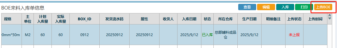 6.进入入库界面后,查询对应的BOE组件来料单,如果找不到可以通过编号和名称查找。最后点击查询。 同时有需要的话可以在下方勾选自己想要的显示选项。 ![]() 7.查询到对应订单之后,按图操作:先进行入库,再上传BOE。 ![]()