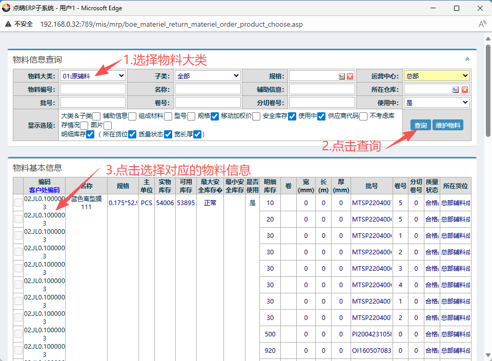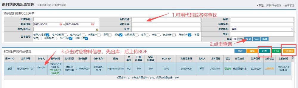 6.进入界面后,按图操作:可用代码或名称查找,点击查询。然后点击对应物料信息,先进行出库,再上传BOE