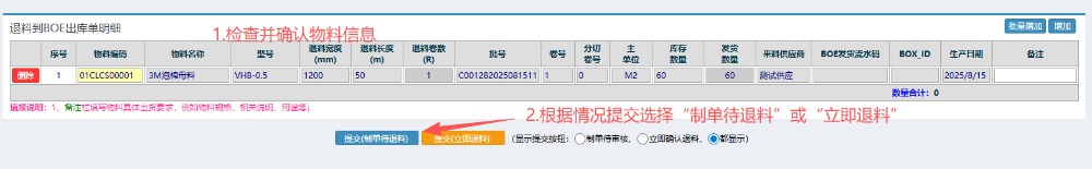 4.选好物料后,检查并确认物料信息,根据情况提交选择“制单待退料”或“立即退料