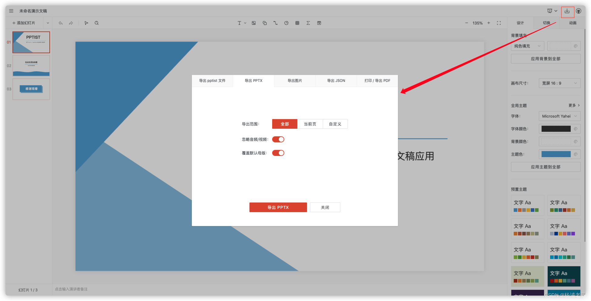 • 导出本地文件(PPTXJSON、图片、PDF