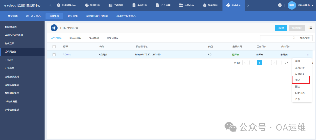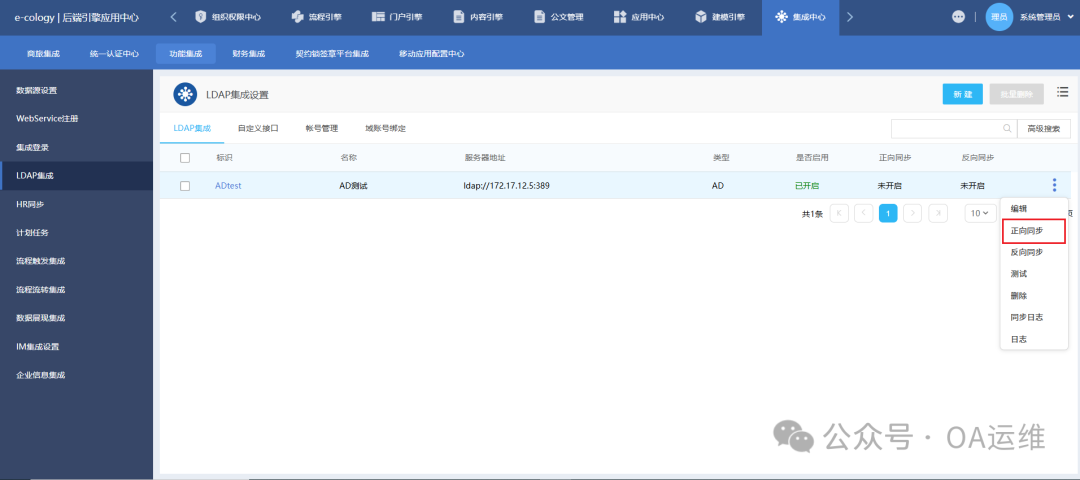 本次记录AD账号同步到泛微OA系统并开启LDAP认证的操作过程,逐步说明操作路径、LDAP集成的基础配置步骤,以指导完成相关集成与认证设置。