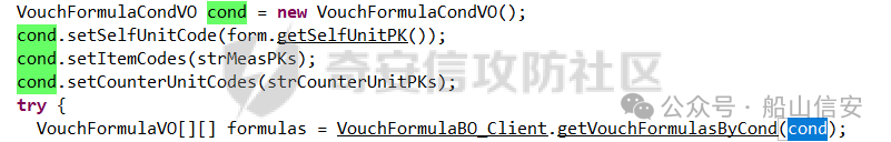 可以反向定位一下,这些传参进了哪些方法当中,可以看到VouchFormulaCondVO中保存了上面的传参,再作为cond传入了getVouchFormulasByCond方法之中