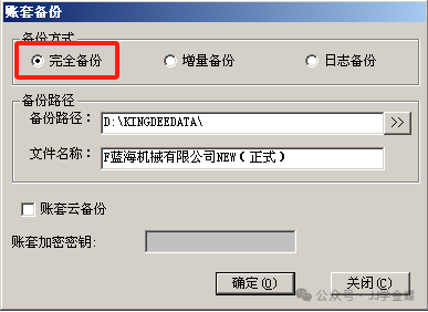 选择备份账套保存位置,建议勾上【备份到企业云盘】,点击【备份】按钮,这样在本地路径和金蝶企业云盘中同时进行备份。