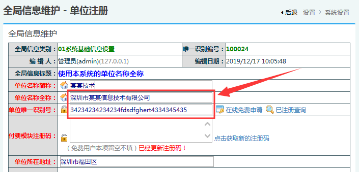 点晴OA系统注册后的单位唯一识别号资料可否更改?[1200]