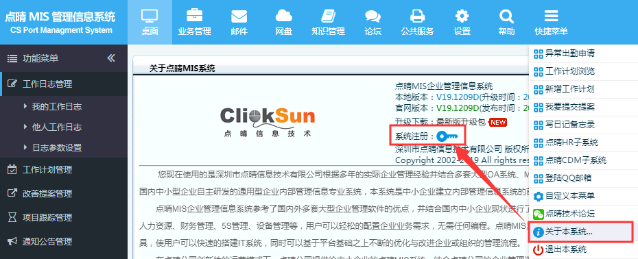 提交无误后,就会立即看到分配到的单位唯一识别码了,将以上红色唯一识别码复制下来。然后复制到点晴OA中以下位置(点晴OA-》快捷菜单-》关于本系统...-》系统注册),提交确认就完成了系统注册。注册后,务必退出浏览器,然后重新打开浏览器进入,新的注册码才会生效。