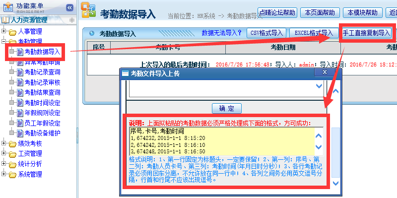 如果按照以上教程操作后,还是搞不定的话,真的无语了!下面还有两个方法,可以确保一定可以将考勤记录导入到点晴OA中。方法一: 进入人力资源管理模块中,找到以下“手工直接复制导入”按钮,将考勤机中导出的考勤记录处理成页面要求的格式,复制进去,就可以顺利将考勤记录导入到点晴OA了:
