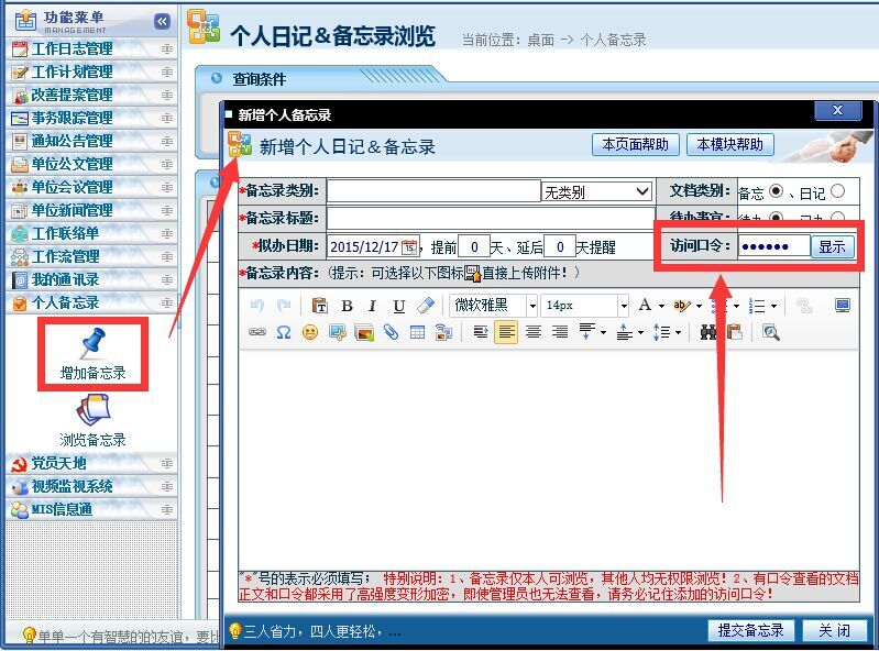 点晴永久免费OA系统个人备忘录使用小技巧:保存我的各类密码